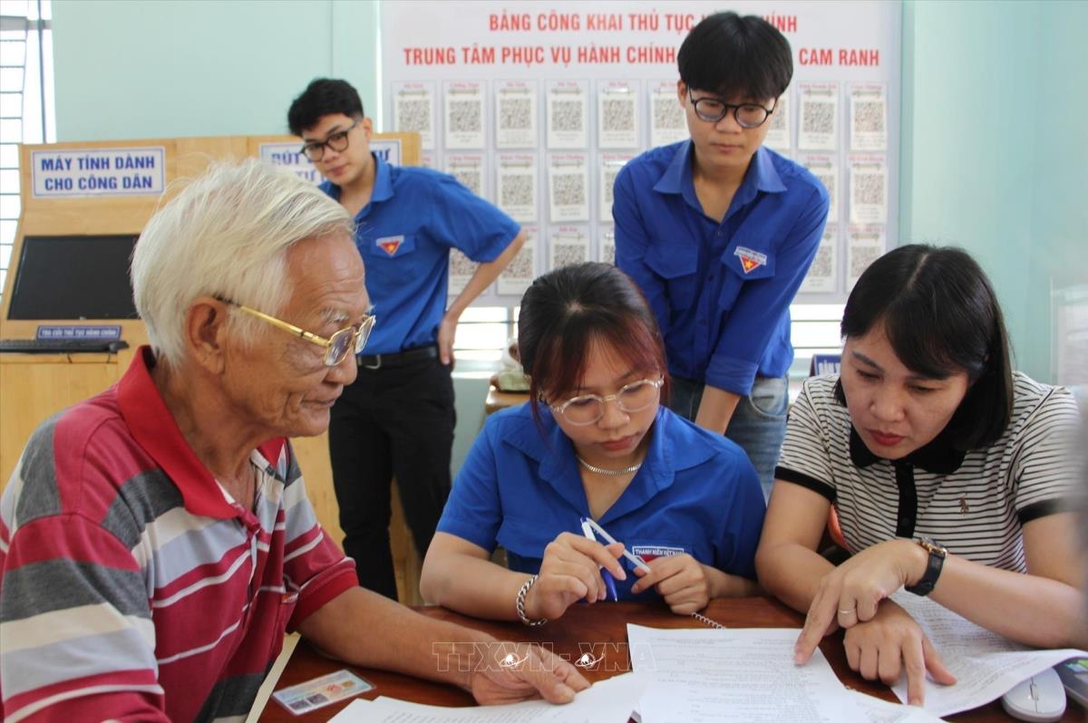 Thanh niên tình nguyện phường Cam Ranh, tỉnh Khánh Hòa hướng dẫn người dân làm thủ tục tại Trung tâm hành chính công sau khi thực hiện mô hình chính quyền hai cấp. Ảnh: Phan Sáu - TTXVN