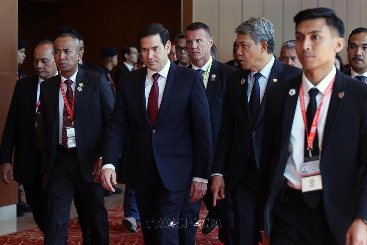 Bộ trưởng Ngoại giao Malaysia, Datuk Seri Mohamad Hasan đón chào Ngoại trưởng Mỹ Marco Rubio đến tham dự Hội nghị Bộ trưởng Ngoại giao ASEAN-Mỹ (10/7/2025). Ảnh: Hằng Linh-PV TTXVN tại Malaysia