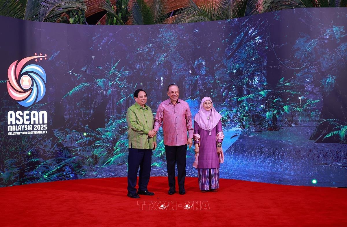 Thủ tướng Malaysia Anwar Ibrahim, Chủ tịch ASEAN 2025 và Phu nhân đón Thủ tướng Phạm Minh Chính (27/10/2025). Ảnh: Dương Giang-TTXVN