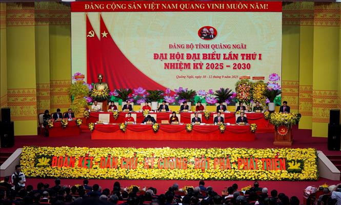Quảng Ngãi (TTXVN 12/9/2025) Sau hơn 2 ngày làm việc, sáng 12/9, Đại hội đại biểu Đảng bộ tỉnh Quảng Ngãi lần thứ Nhất, nhiệm kỳ 2025 - 2030 đã bế mạc. Đây là địa phương đầu tiên trong cả nước tổ chức thành công Đại hội đại biểu Đảng bộ tỉnh lần thứ Nhất, nhiệm kỳ 2025 - 2030.