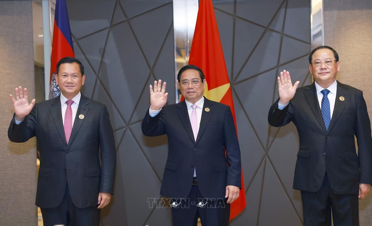Thủ tướng Phạm Minh Chính cùng Thủ tướng Lào Sonexay Siphandone và Thủ tướng Campuchia Hun Manet (26/5/2025). Ảnh: Dương Giang-TTXVN