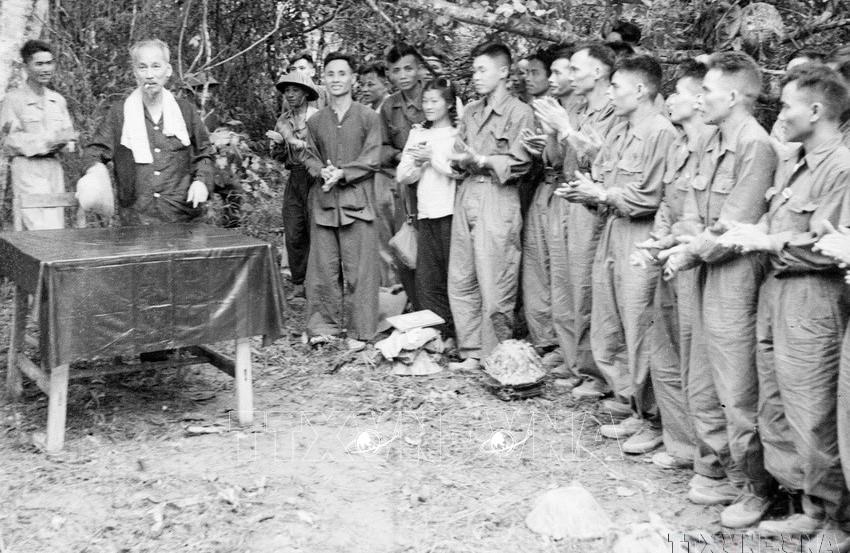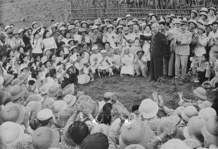 Chủ tịch Hồ Chí Minh nói chuyện với cán bộ, chiến sỹ tham gia chiến dịch biên giới 1950. Ảnh: TTXVN