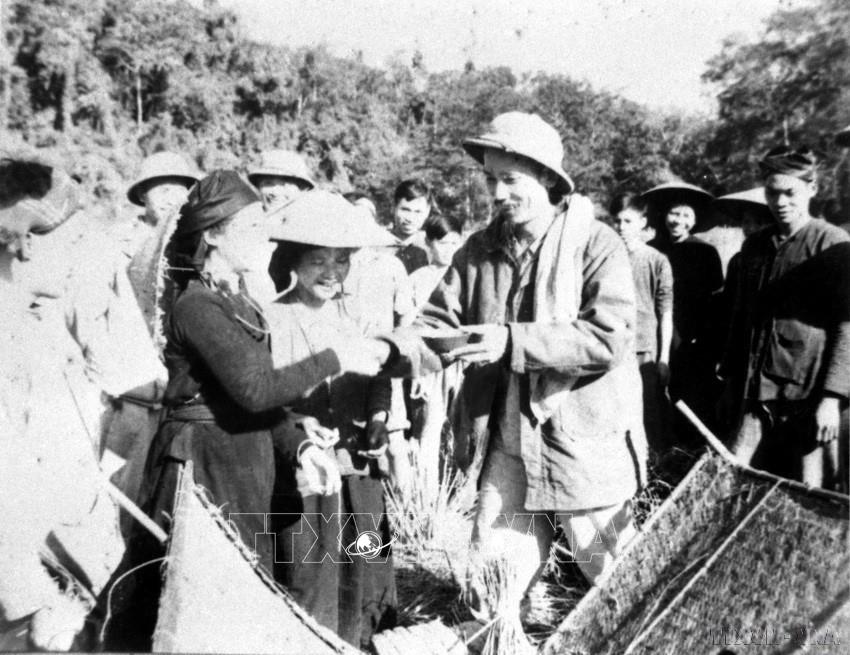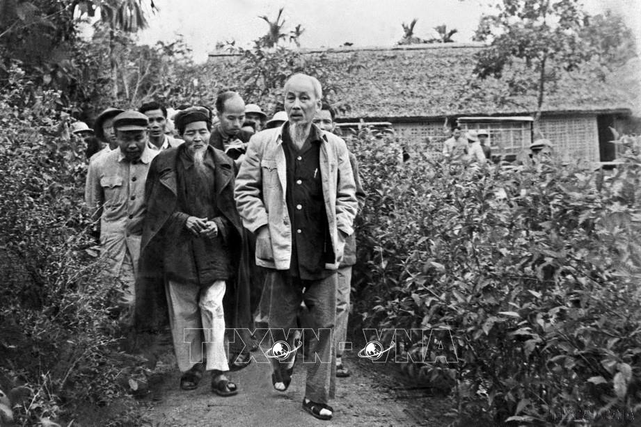 Chủ tịch Hồ Chí Minh thăm nông dân xã Hùng Sơn, huyện Đại Từ (Thái Nguyên) đang thu hoạch vụ lúa mùa đầu tiên sau cải cách ruộng đất (1954). Ảnh: TTXVN