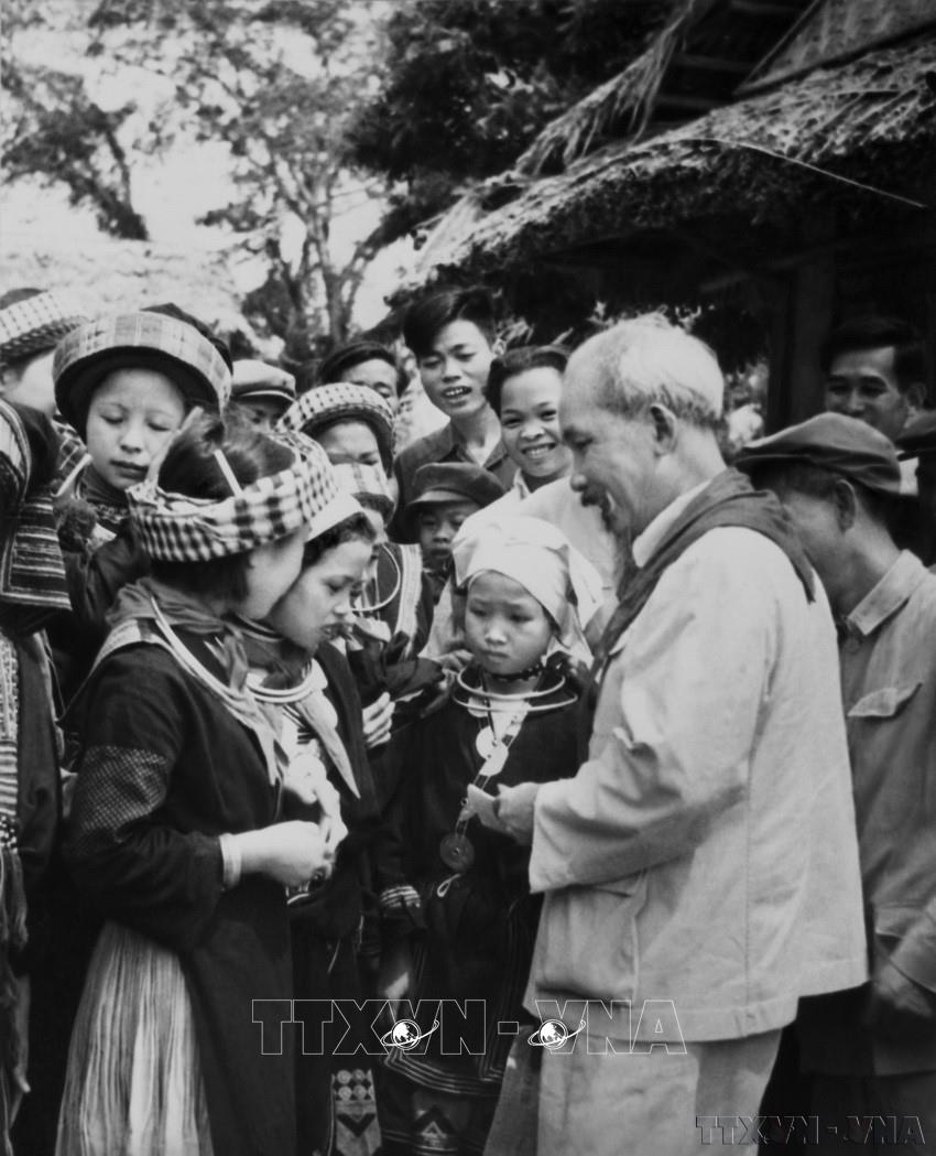 Hồ Chủ tịch đến thăm trường thiếu nhi các dân tộc vùng cao Việt Bắc ở Thái Nguyên (13/3/1960). Ảnh: TTXVN
