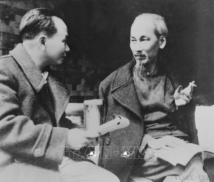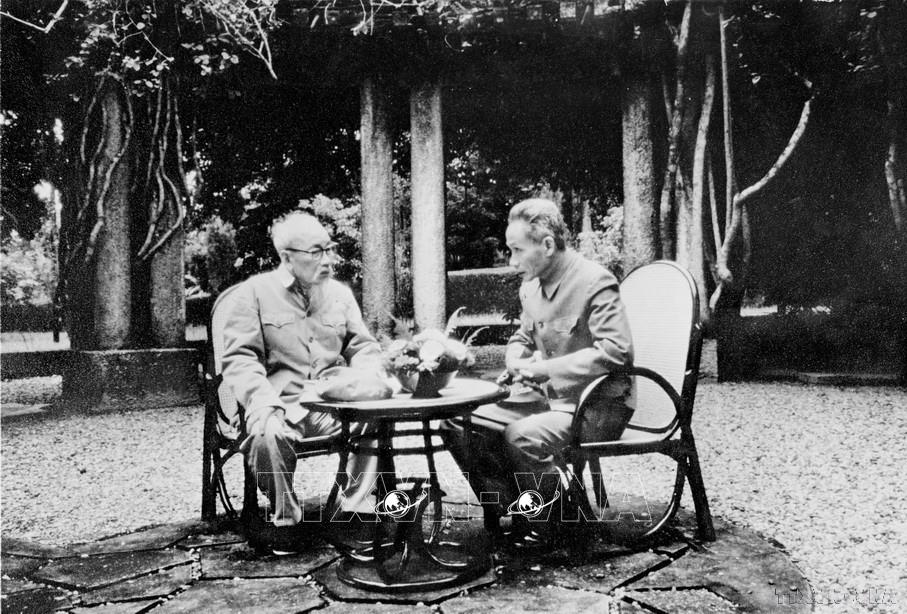 Chủ tịch Hồ Chí Minh và Tổng Bí thư Đảng Lao động Việt Nam Trường Chinh trong một buổi làm việc (Hà Nội, 1955). Ảnh: THX/TTXVN phát