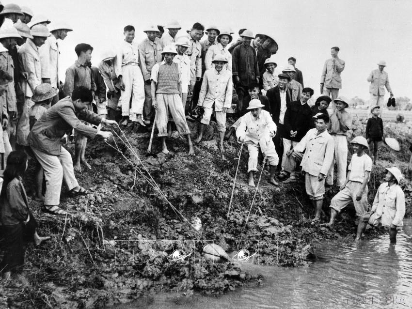 Chủ tịch Hồ Chí Minh tát nước chống hạn với bà con nông dân xã Đại Thanh, tỉnh Hà Đông (nay là Hà Nội) ngày 12/1/1958. Ảnh: Đinh Đăng Định - TTXVN