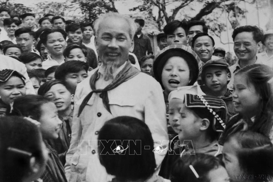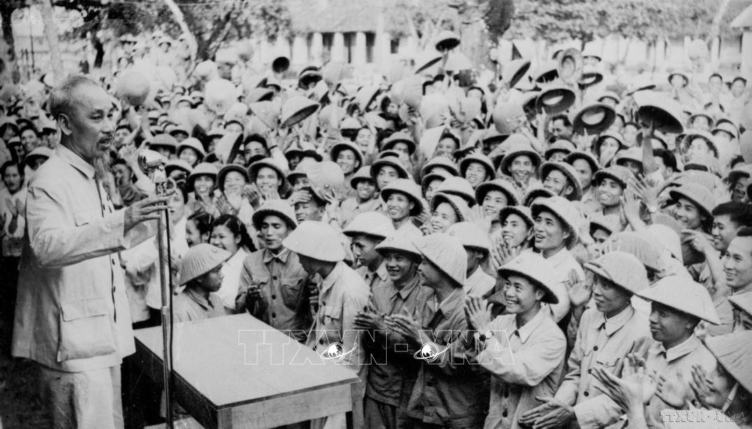 Chủ tịch Hồ Chí Minh chỉ đạo công tác Bình dân học vụ, một trong những hoạt động trọng tâm ngay sau Cách mạng tháng Tám tại Thủ đô Hà Nội (1954). Ảnh: TTXVN