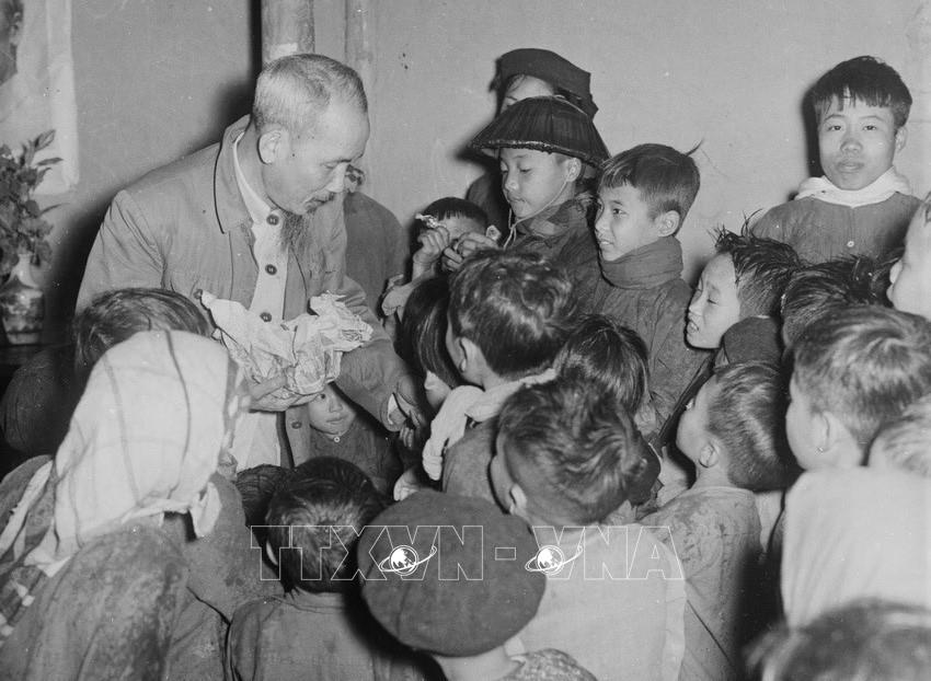 Bác Hồ chia kẹo cho các cháu thiếu nhi xã Tiền Phong, huyện Bình Xuyên, tỉnh Vĩnh Phúc, nhân dịp Bác về chúc Tết địa phương, năm 1956. Ảnh: TTXVN