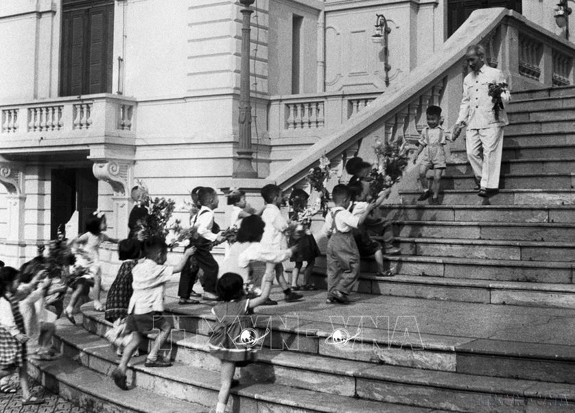 Các cháu thiếu nhi Thủ đô đến chúc thọ Bác Hồ tại Phủ Chủ tịch, ngày 19/5/1958. Ảnh: TTXVN