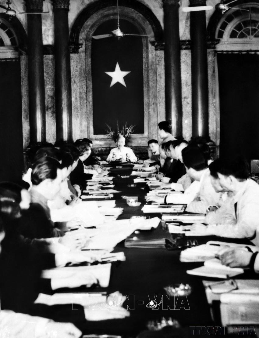 Chủ tịch Hồ Chí Minh chủ tọa phiên họp của Hội đồng Chính phủ bàn kế hoạch khôi phục và phát triển kinh tế 3 năm 1958-1960. Ảnh: TTXVN