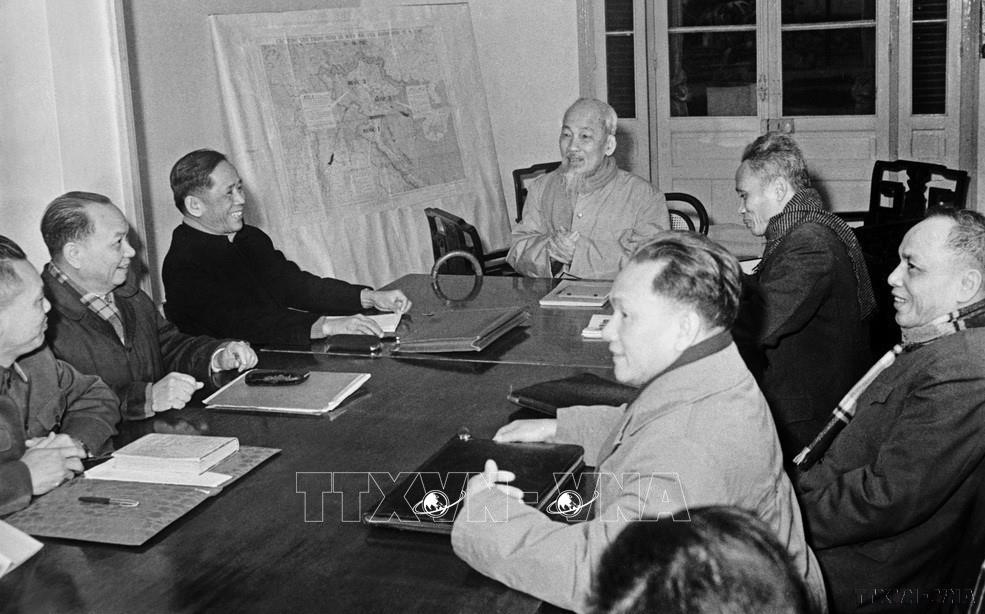 Ngày 6/12/1953, Bộ Chính trị tổ chức cuộc họp dưới sự chủ trì của Chủ tịch Hồ Chí Minh để nghe Tổng Quân ủy báo cáo và duyệt lần cuối kế hoạch tác chiến Đông-Xuân 1953-1954, đồng thời quyết định mở Chiến dịch Điện Biên Phủ. Ảnh: TTXVN
