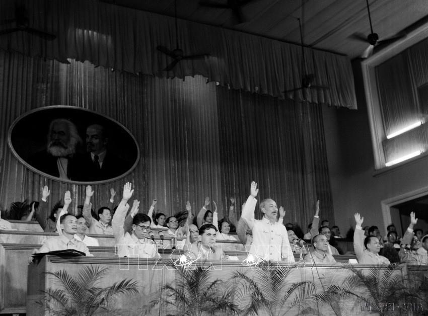 Hồ Chủ tịch cùng các đại biểu biểu quyết thông qua các văn kiện tại Đại hội đại biểu toàn quốc lần thứ III của Đảng (9/1960). Ảnh: TTXVN