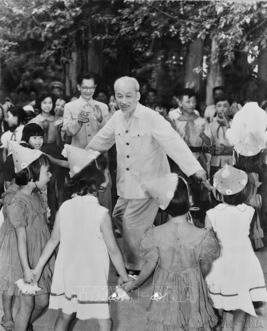 Bác Hồ vui múa hát cùng các cháu thiếu nhi tại Phủ Chủ tịch trong dịp Ngày Quốc tế thiếu nhi 1/6/1960. Ảnh: TTXVN