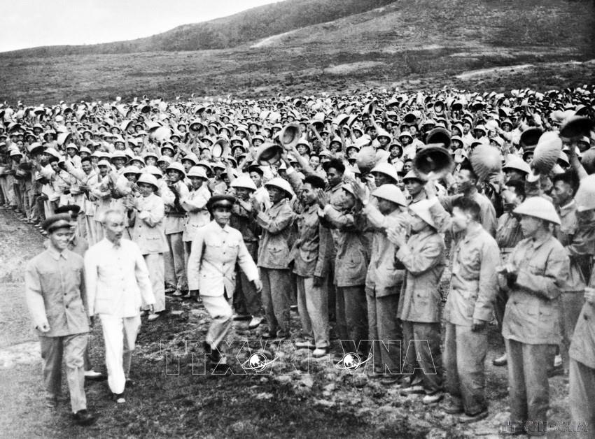Chủ tịch Hồ Chí Minh đi thăm và kiểm tra một đơn vị bộ đội miền Nam tập kết ra Bắc đang diễn tập trước khi trở lại chiến trường miền Nam (6/1957). Ảnh: TTXVN