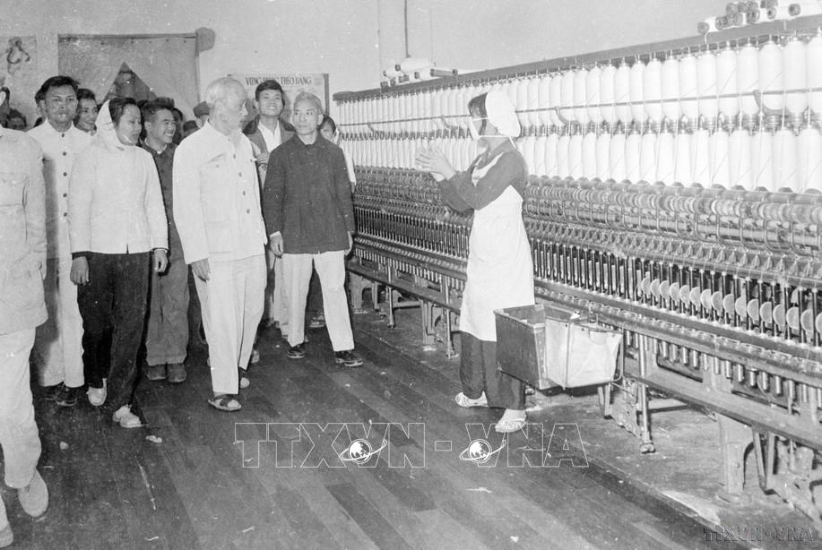 Chủ tịch Hồ Chí Minh đến thăm nhà máy dệt 8/3 và dự lễ khánh thành nhà máy. Người đến thăm một số phân xưởng và nói chuyện với công nhân làm việc tại nhà máy ngày 8/3/1965. Ảnh: TTXVN