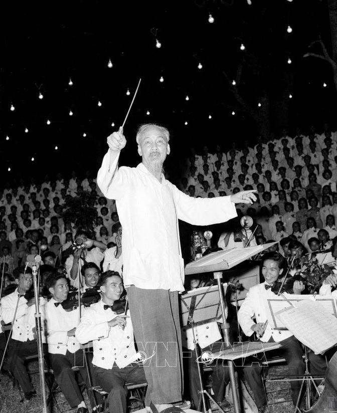 Hồ Chủ tịch bắt nhịp bài hát “Kết đoàn” trong buổi dạ hội của Nhân dân Thủ đô chào mừng Đại hội Đảng toàn quốc lần thứ III (9/1960). Ảnh: TTXVN