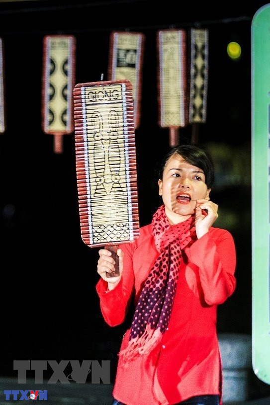 “Anh hiệu” Nguyễn Đáng “chị hiệu”, Phan Thị Hoa là linh hồn của một buổi biểu diễn bài Chòi ở phố cổ Hội An. (Ảnh: Trọng Đạt/TTXVN)