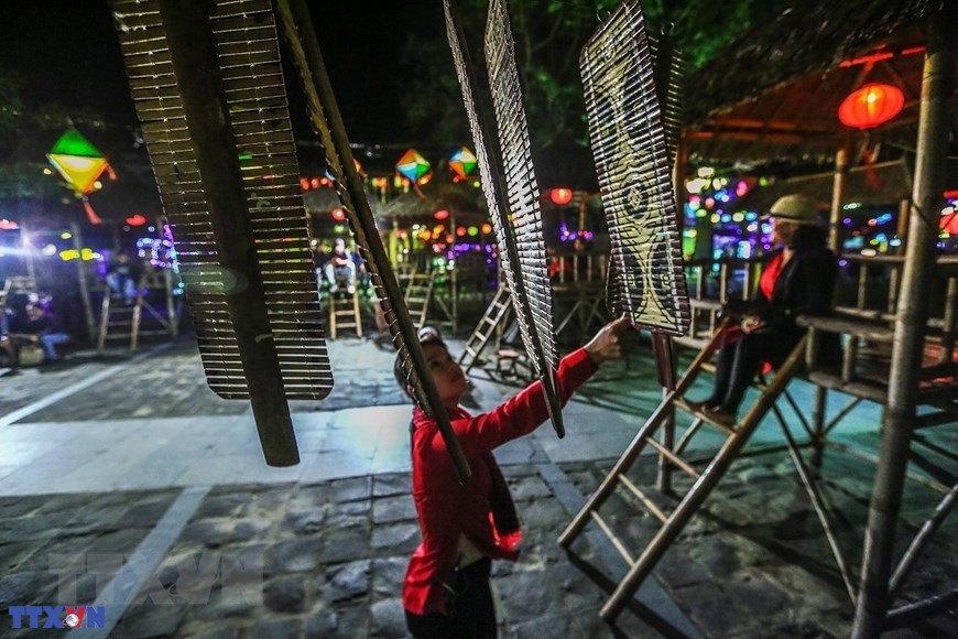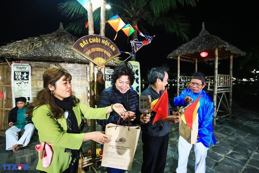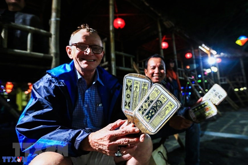 Du khách tham gia rút thẻ bài hô hát khi thưởng lãm nghệ thuật Bài Chòi ở phố cổ Hội An. (Ảnh: Trọng Đạt/TTXVN)