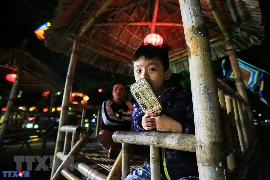 Các em nhỏ rất thích thú khi được bố mẹ cho trải nghiệm ngồi chòi tre xem diễn xướng nghệ thuật Bài Chòi ở phố cổ Hội An. (Ảnh: Trọng Đạt/TTXVN)