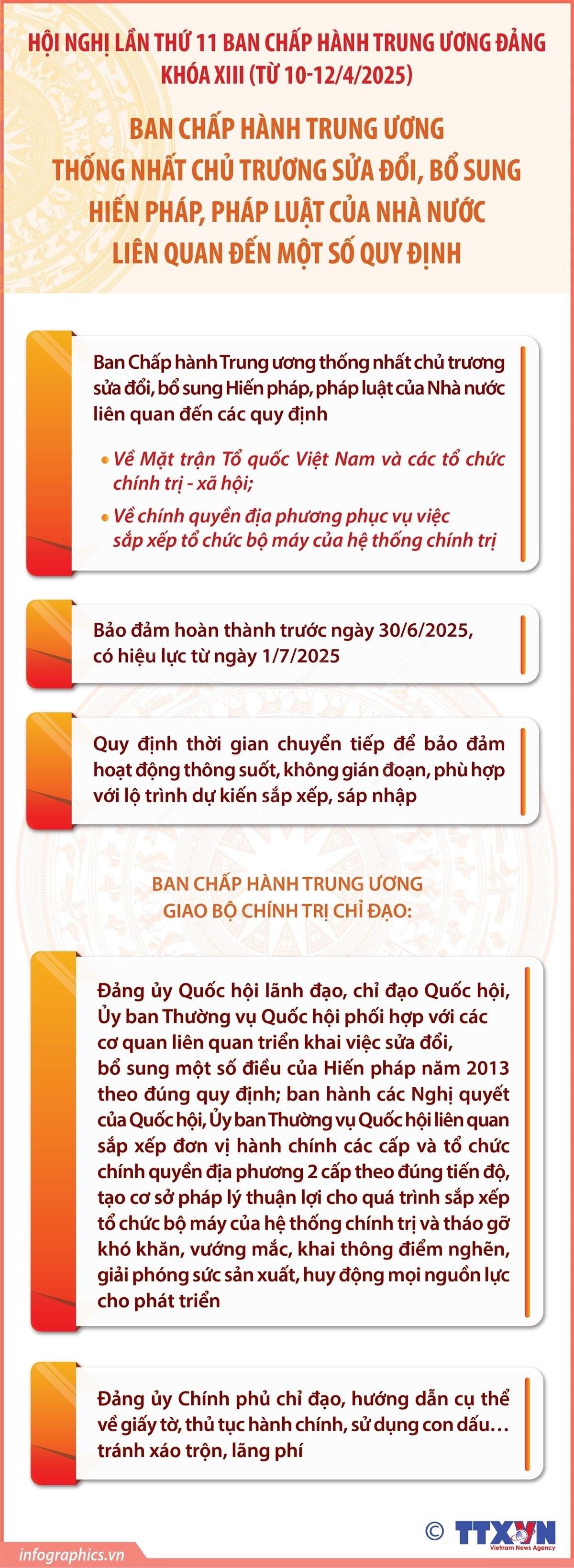 Hà Nội (TTXVN 13/4/2025) Tại hội nghị lần thứ 11, Ban Chấp hành Trung ương khóa XIII thống nhất chủ trương sửa đổi, bổ sung Hiến pháp, pháp luật của Nhà nước liên quan đến các quy định về Mặt trận Tổ quốc Việt Nam và các tổ chức chính trị - xã hội; các quy định về chính quyền địa phương phục vụ việc sắp xếp tổ chức bộ máy của hệ thống chính trị; bảo đảm hoàn thành trước ngày 30/6/2025, có hiệu lực từ ngày 01/7/2025; quy định thời gian chuyển tiếp để bảo đảm hoạt động thông suốt, không gián đoạn, phù hợp với lộ trình dự kiến sắp xếp, sáp nhập.
