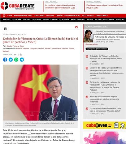 Hà Nội (TTXVN 2/5/2025) Nhân kỷ niệm 50 năm Ngày giải phóng miền Nam, thống nhất đất nước (30/4/1975 - 30/4/2025), Đại sứ Việt Nam tại Cuba Lê Quang Long đã trả lời phỏng vấn báo điện tử Cubadebate về ý nghĩa lịch sử của sự kiện trọng đại này.
