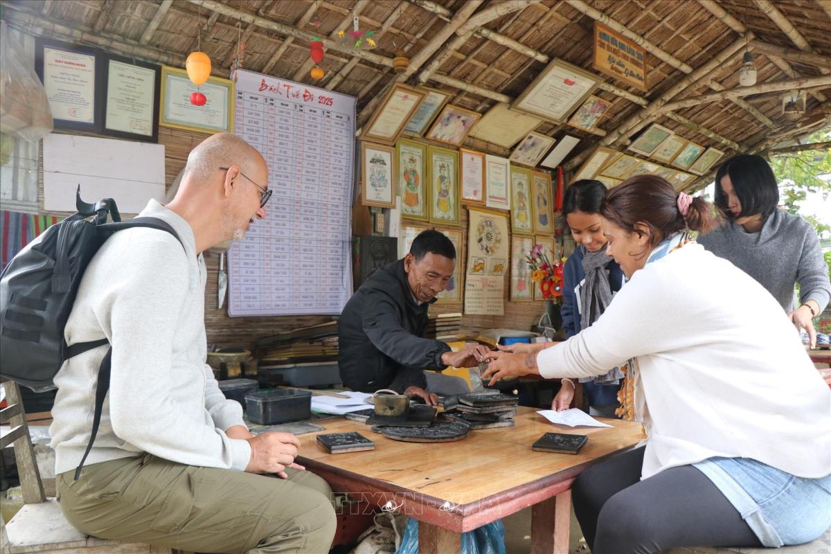 Du khách nước ngoài trải nghiệm các công đoạn in tranh. (Ảnh: Tường Vi/TTXVN)