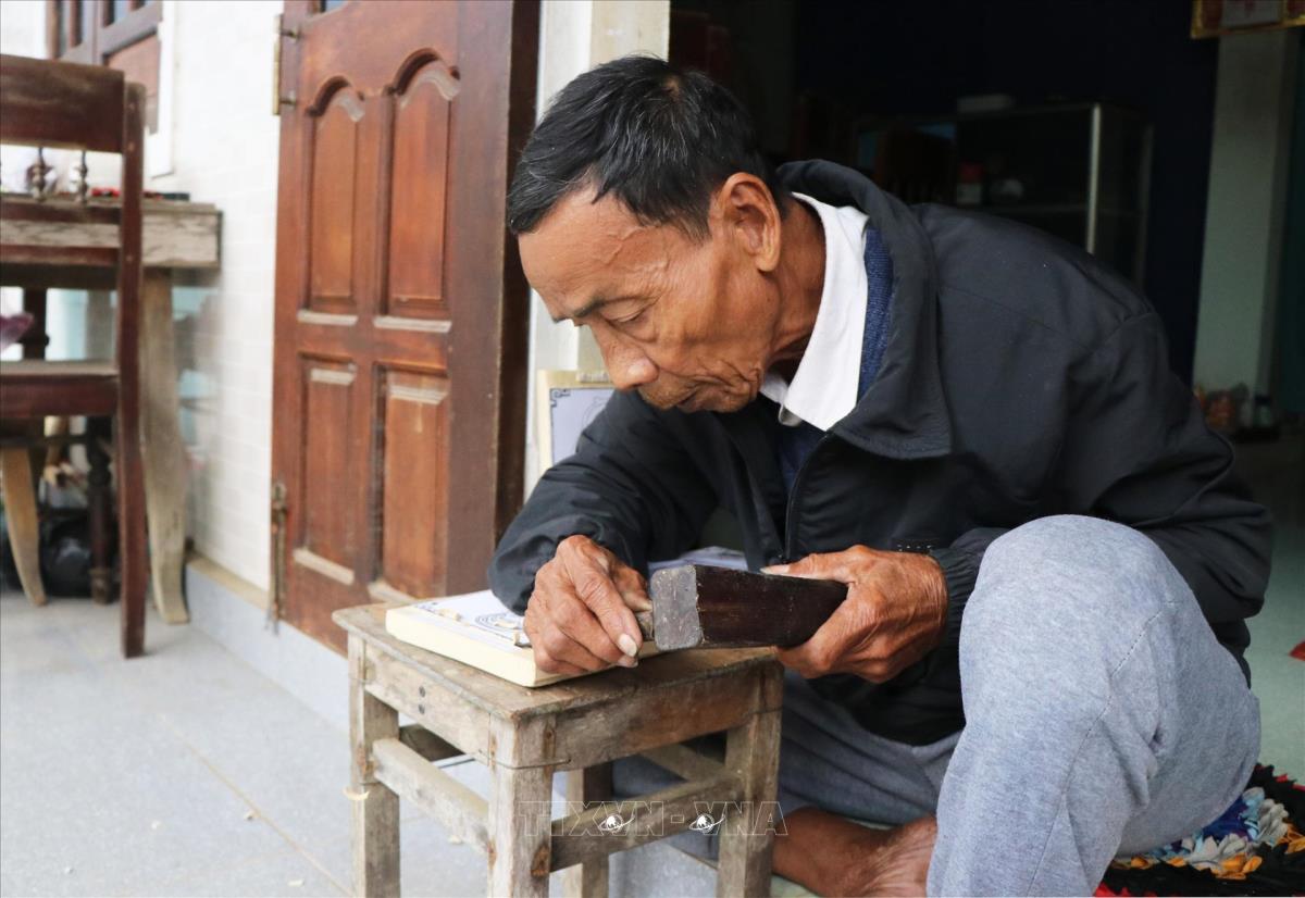Nghệ nhân Kỳ Hữu Phước nghiên cứu để sáng tạo bản khắc tranh làng Sình. (Ảnh: Tường Vi/TTXVN)