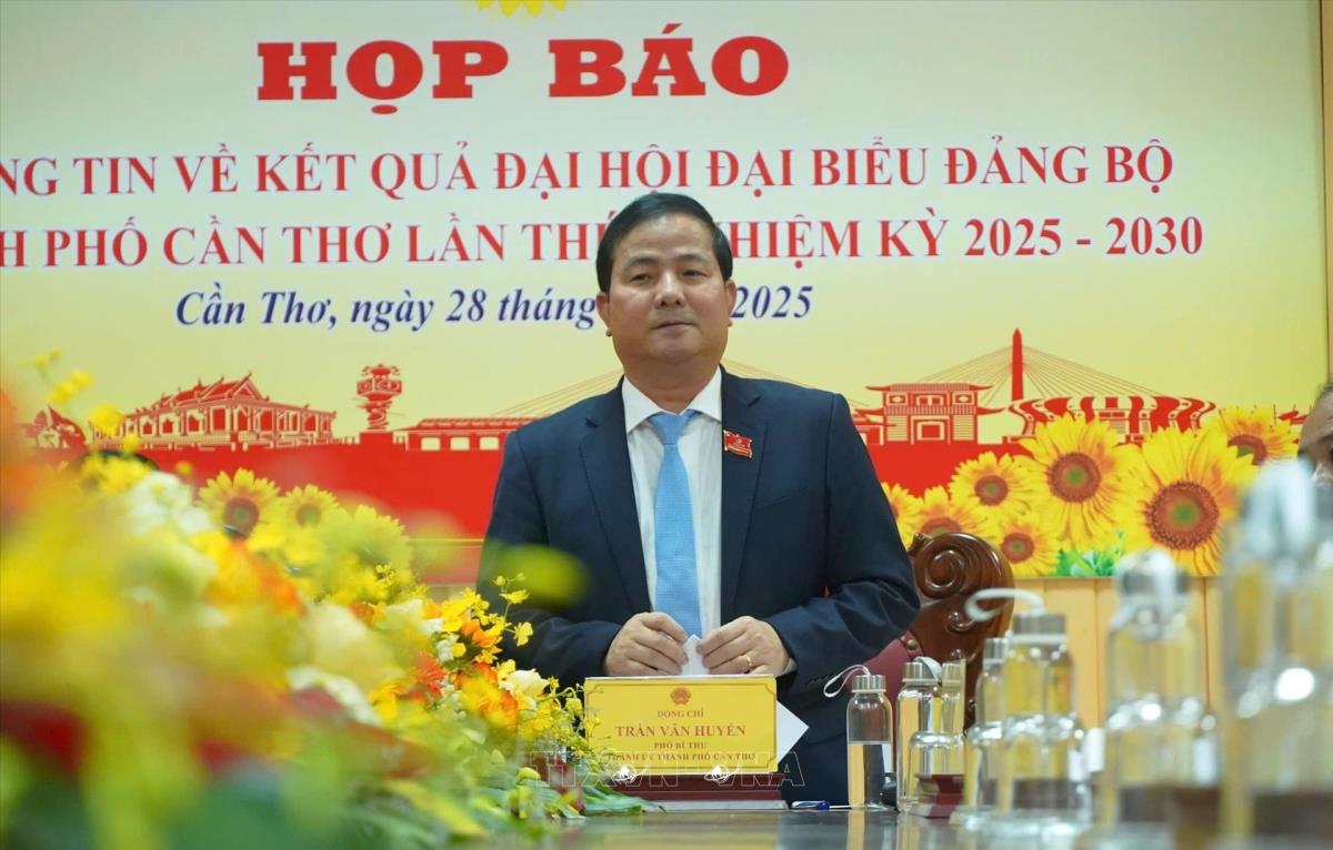 Ông Trần Văn Huyến, Phó Bí thư Thành ủy Cần Thơ, chủ trì cuộc họp báo phát biểu (28/9/2025). Ảnh TTXVN phát