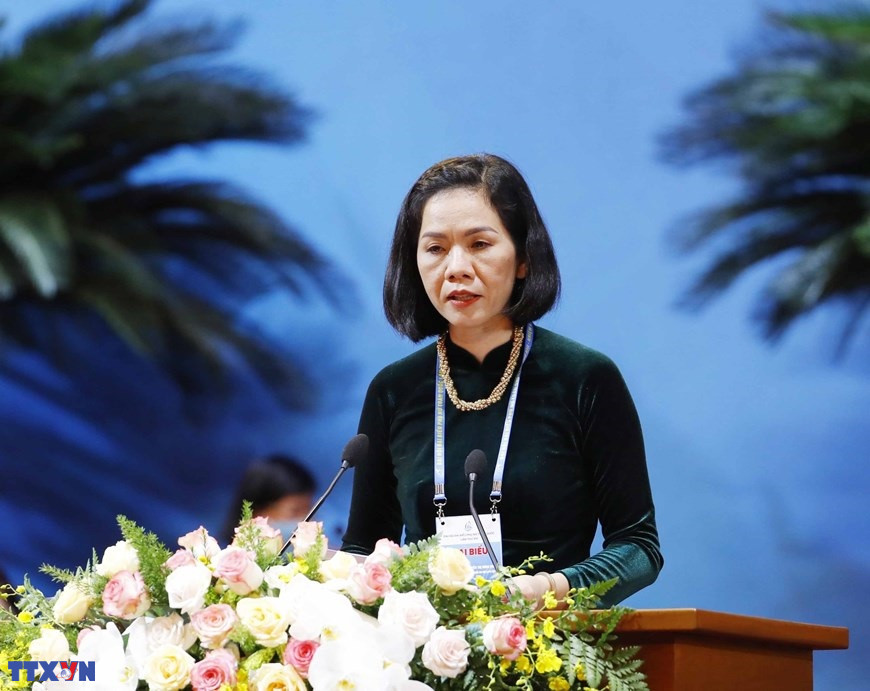Phó Chủ tịch Hội Phụ nữ Việt Nam trình bày báo cáo giải trình, tiếp thu ý kiến thảo luận về dự thảo Báo cáo chính trị tại Đại hội. (Ảnh: Phương Hoa/TTXVN)