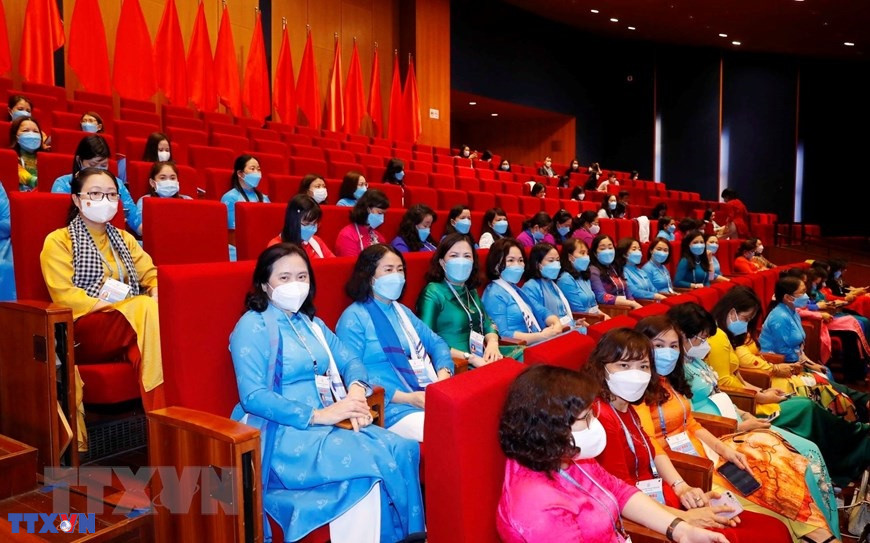 Ban Chấp hành Trung ương Hội Liên hiệp Phụ nữ Việt Nam khóa XIII ra mắt Đại hội. (Ảnh: Minh Đức/TTXVN)