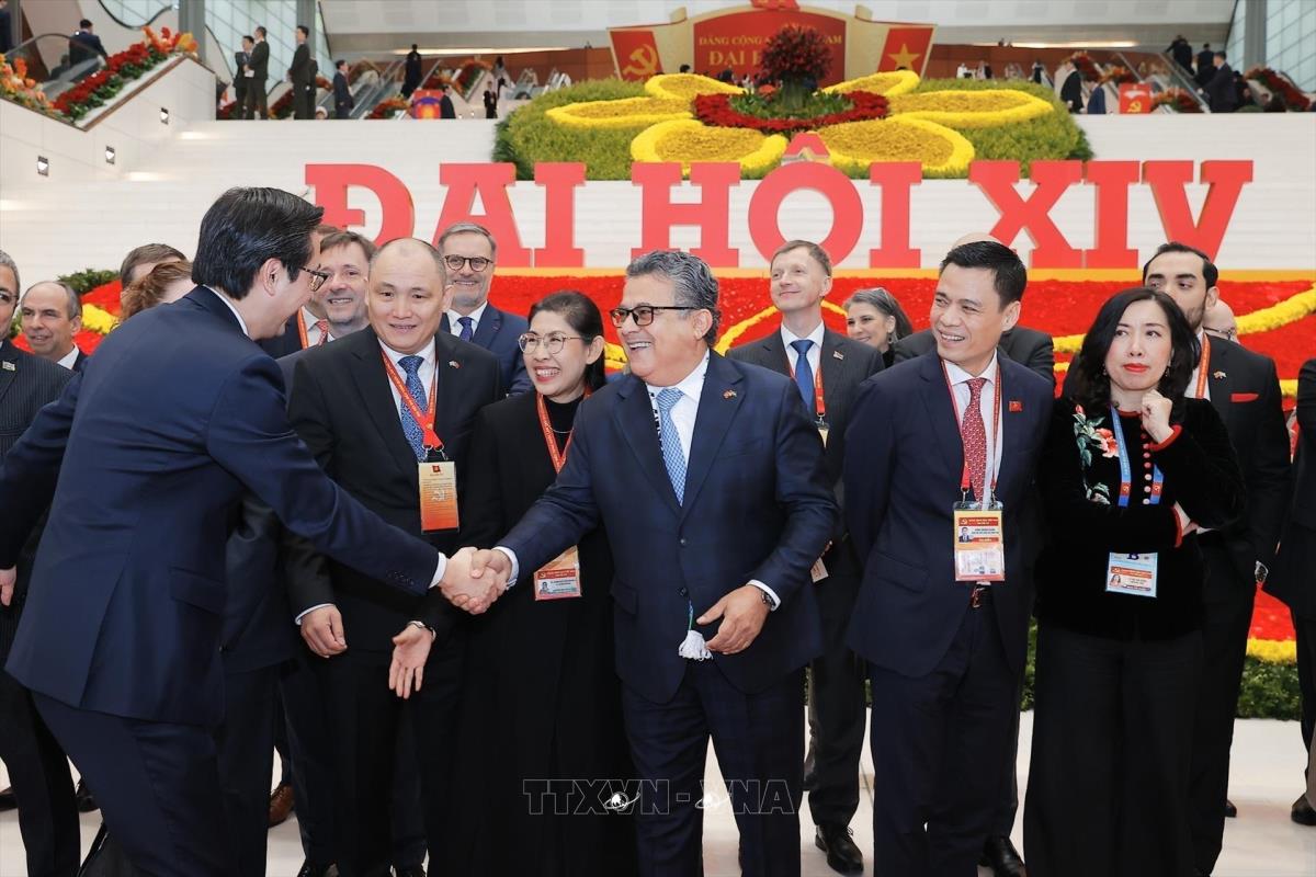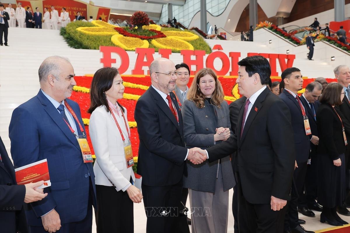Chủ tịch nước Lương Cường với các đại biểu quốc tế tới dự phiên bế mạc Đại hội XIV của Đảng (23/1/2026). Ảnh: TTXVN