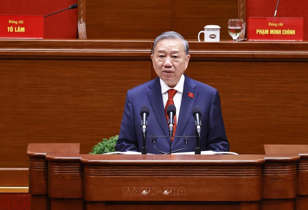 Tổng Bí thư Tô Lâm thay mặt BCH Trung ương Đảng khóa XIV phát biểu ý kiến (23/1/2026). Ảnh: TTXVN