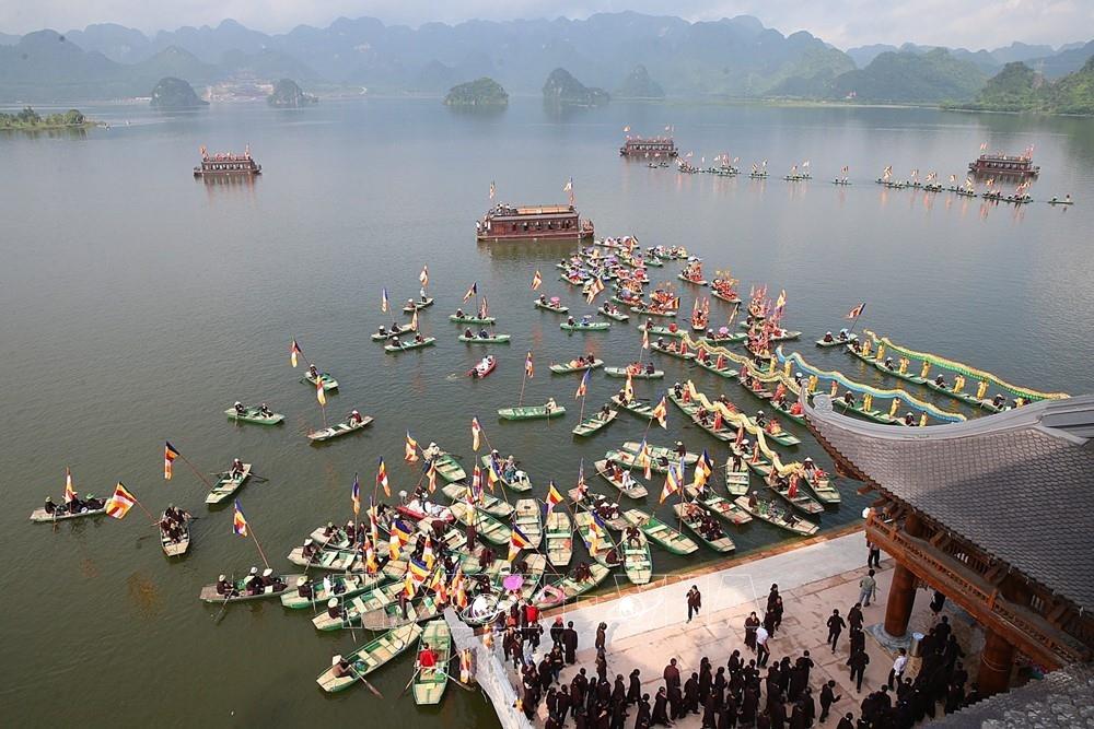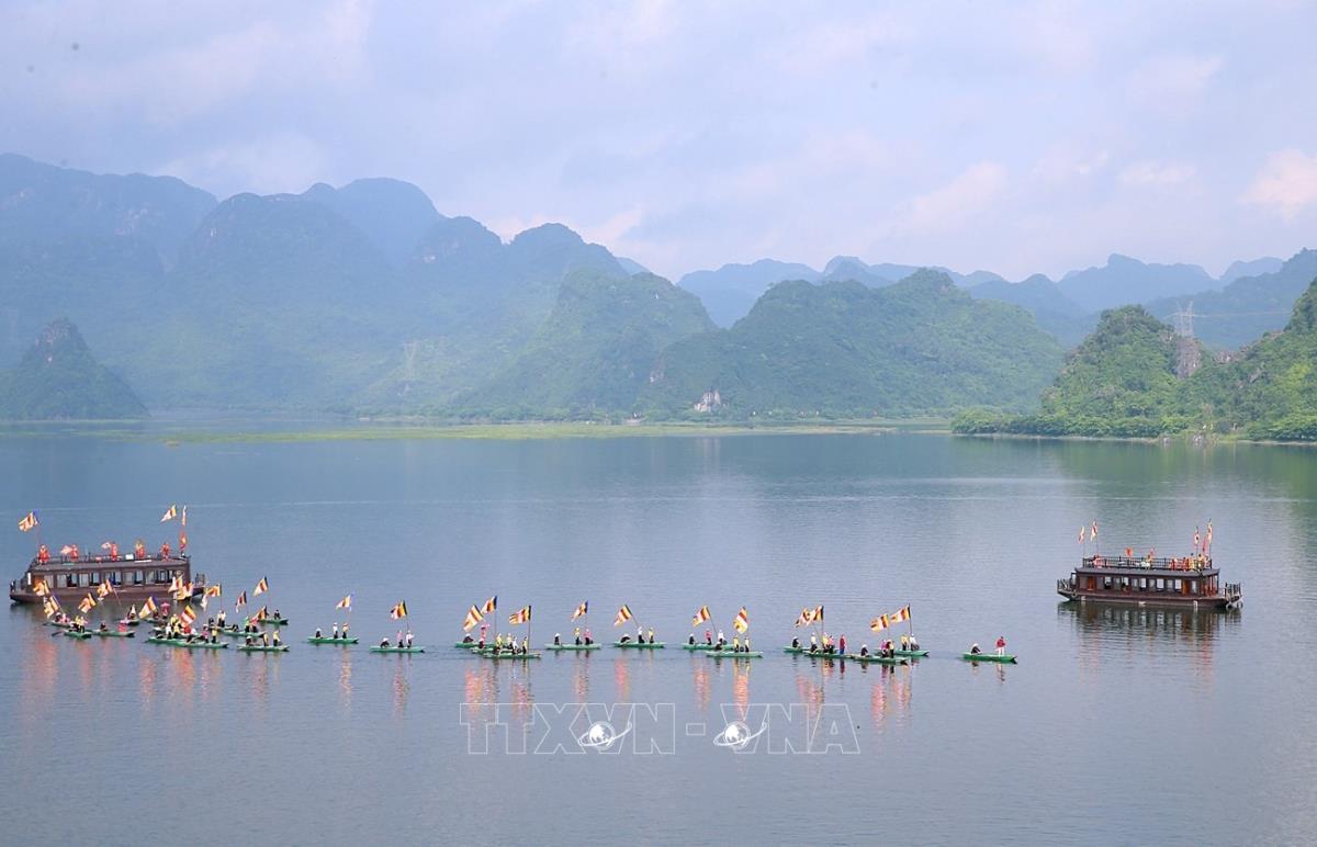 Biểu diễn văn hóa truyền thống dân tộc trên hồ Tam Chúc chào mừng thành công đại lễ Vesak 2019. Ảnh: Dương Giang - TTXVN