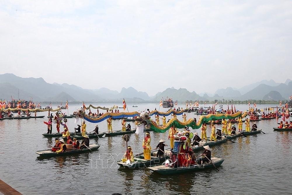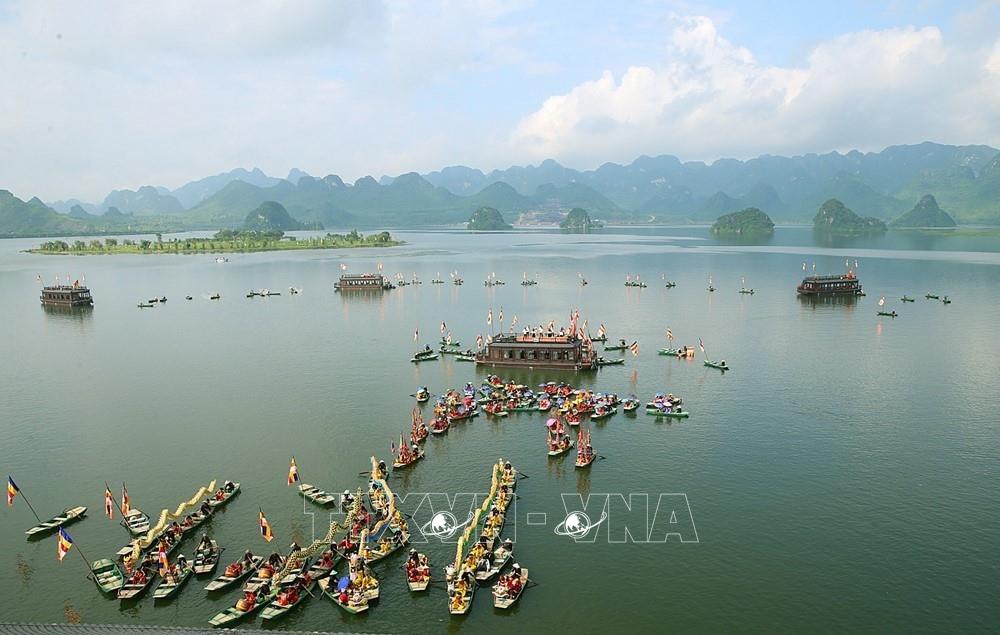 Biểu diễn văn hóa truyền thống trên hồ Tam Chúc chào mừng thành công đại lễ Vesak 2019. Ảnh: Dương Giang - TTXVN