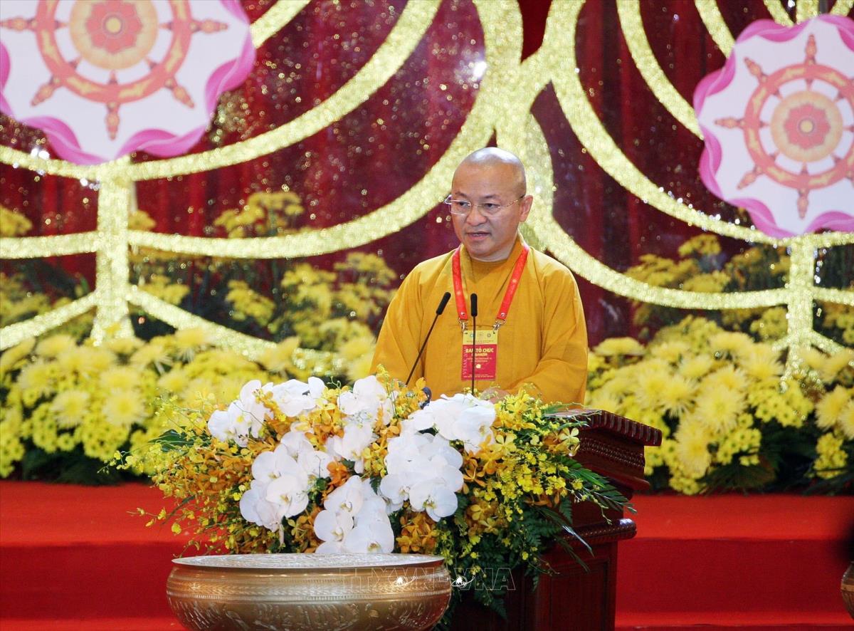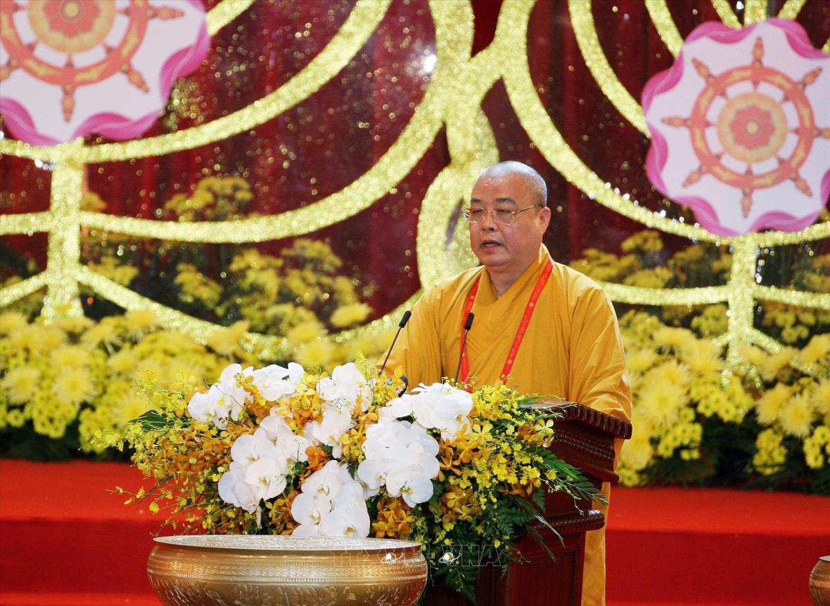 Hoà thượng Thích Thanh Nhiễu, Phó Chủ tịch Thường trực Hội đồng Trị sự Trung ương Giáo hội Phật giáo Việt Nam, Phó Chủ tịch Thường trực Ủy ban Tổ chức quốc gia Đại lễ Vesak LHQ 2019 đọc diễn văn bế mạc (14/5/2019). Ảnh: Nguyễn Dân - TTXVN