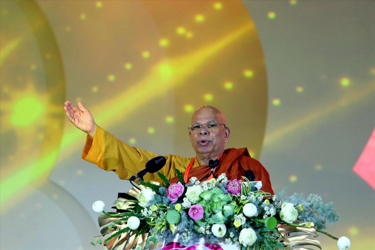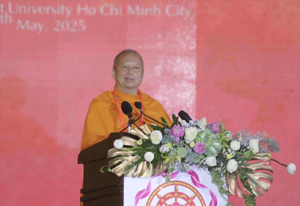 Hòa thượng Tiến sỹ T.Dhammaratana, Phó Chủ tịch Uỷ ban tổ chức Quốc tế Đại lễ Vesak Liên hợp quốc (ICDV), đọc Tuyên bố Thành phố Hồ Chí Minh (8/5/2025). Ảnh: Thanh Vũ-TTXVN