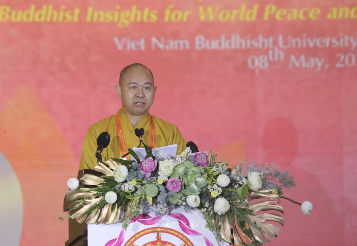 Thượng toạ Thích Đức Thiện, Phó Chủ tịch, Tổng Thư ký Hội đồng Trị sự Giáo hội Phật giáo Việt Nam phát biểu tại lễ bế mạc (8/5/2025). Ảnh: Thanh Vũ-TTXVN