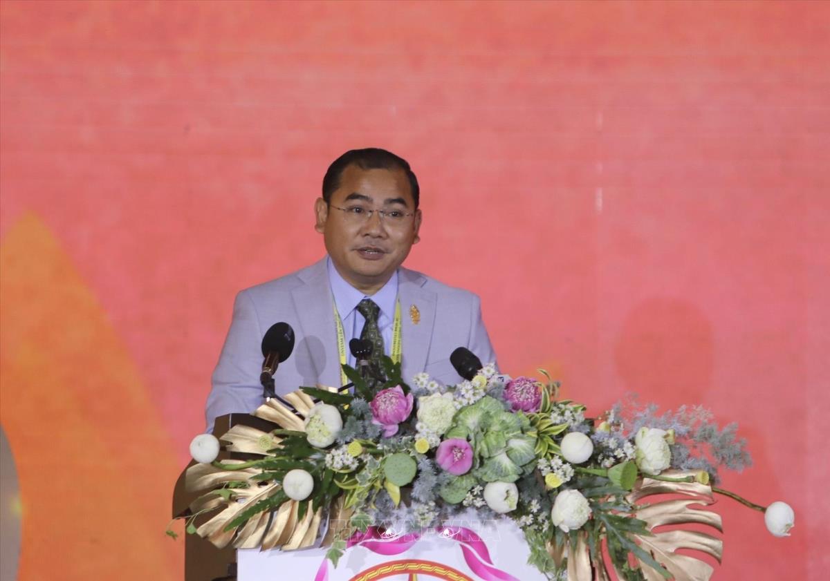 Ông Chhat Chhet, Quốc vụ khanh Bộ Nghi lễ và Tôn giáo Vương quốc Campuchia phát biểu tại lễ bế mạc (8/5/2025). Ảnh: Thanh Vũ-TTXVN