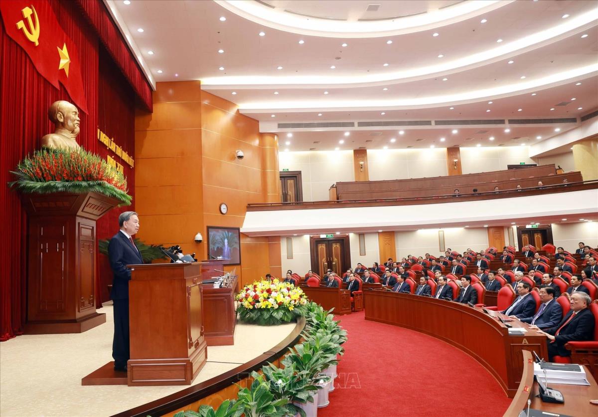 Tổng Bí thư Tô Lâm phát biểu bế mạc Hội nghị lần thứ 11 Ban Chấp hành Trung ương Đảng khóa XIII (12/4/2025). Ảnh: Doãn Tấn - TTXVN