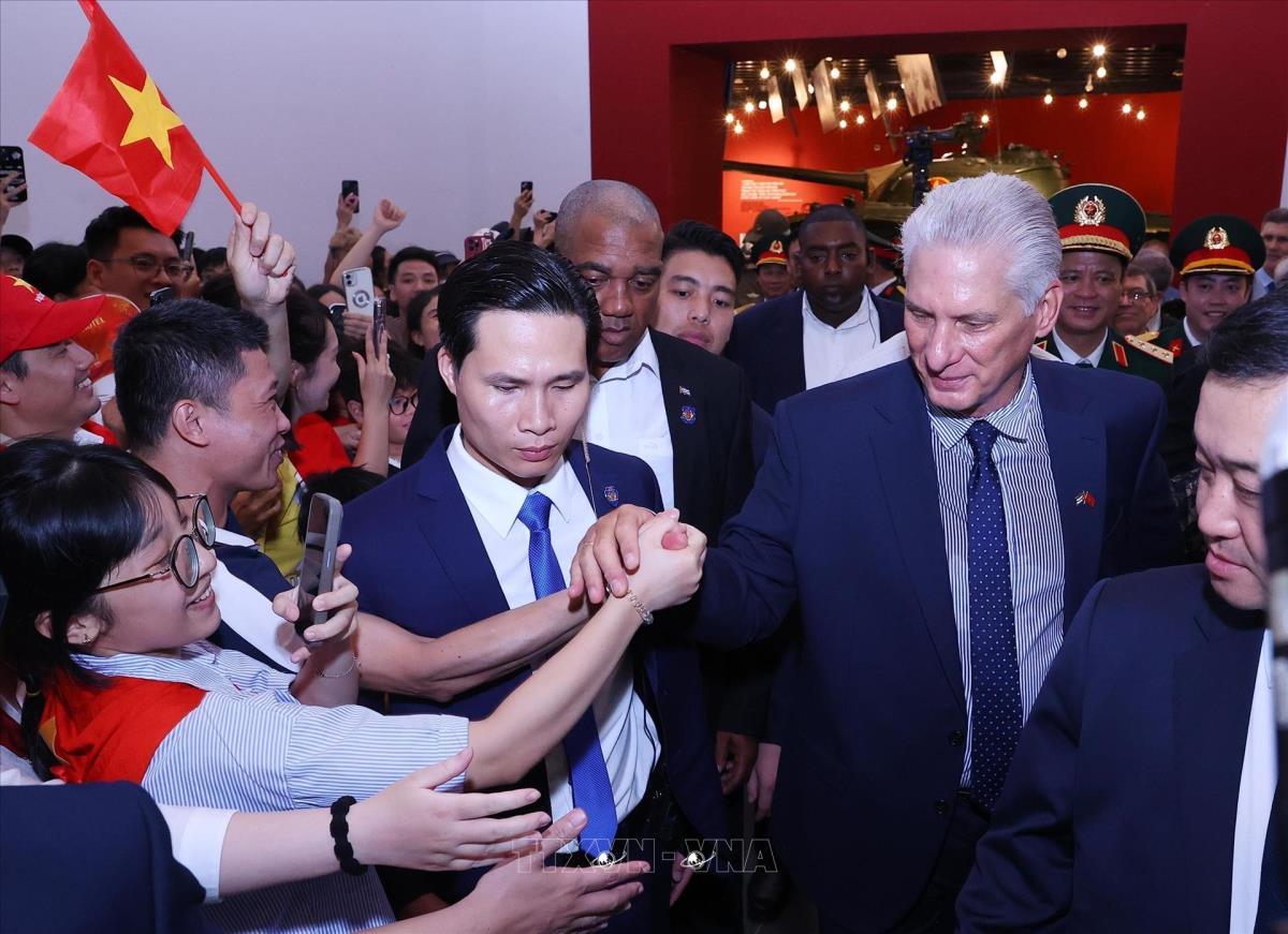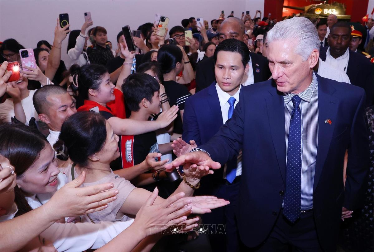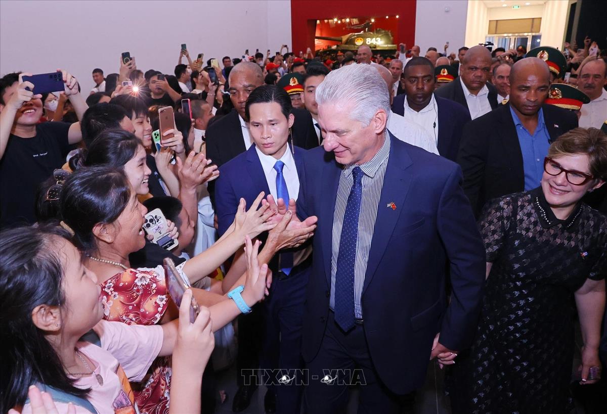 Bí thư Thứ nhất, Chủ tịch nước Cuba Miguel Díaz-Canel Bermúdez giao lưu với người dân tại Bảo tàng Lịch sử Quân sự Việt Nam (31/8/2025). Ảnh: Văn Điệp – TTXVN