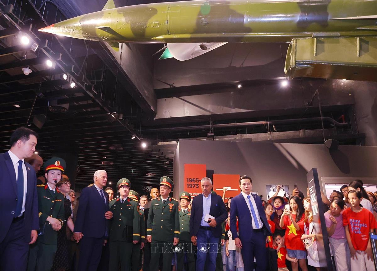 Tại Bảo tàng Lịch sử Quân sự Việt Nam, đồng chí Miguel Díaz-Canel Bermúdez và Phu nhân tham quan các khu trưng bày, lắng nghe giới thiệu về những trang sử hào hùng, những cuộc đấu tranh kiên cường, bất khuất của quân và dân Việt Nam qua các thời kỳ (31/8/2025). Ảnh: Văn Điệp – TTXVN