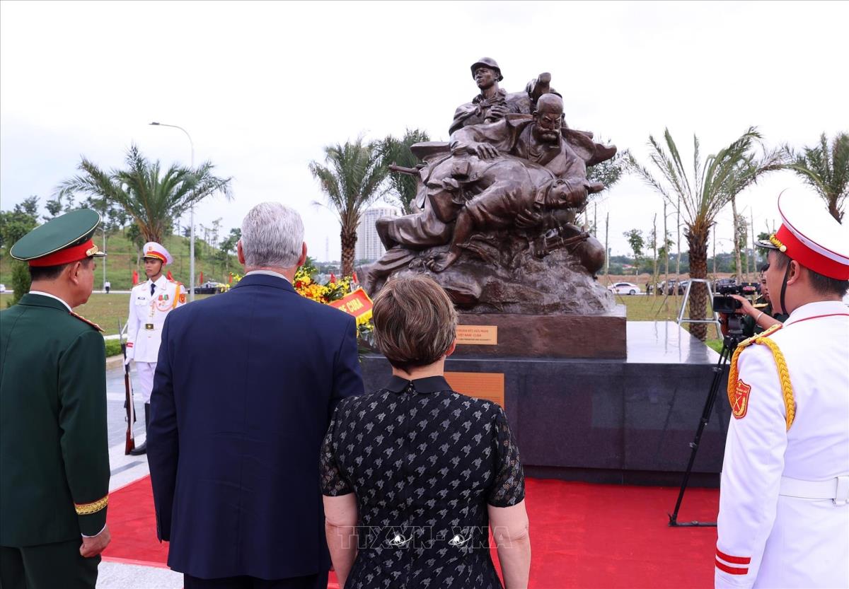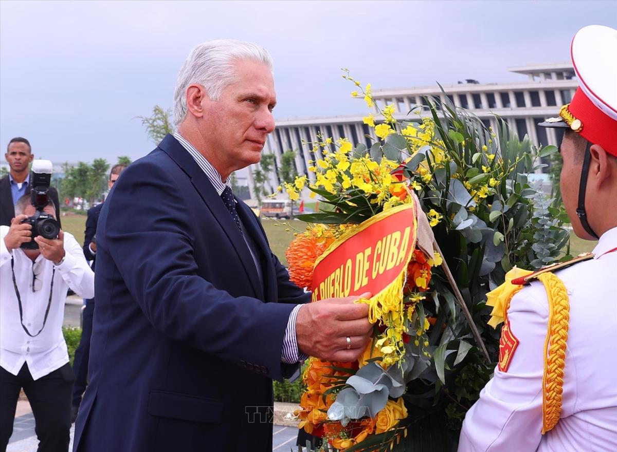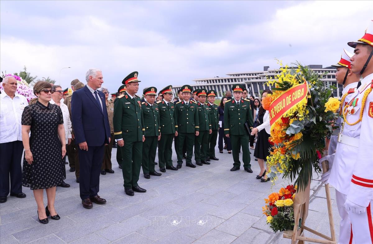 Bí thư Thứ nhất, Chủ tịch nước Cuba Miguel Díaz-Canel Bermúdez và Phu nhân tới đặt vòng hoa tại cụm tượng tri ân các chuyên gia quân sự Cuba tại Bảo tàng Lịch sử Quân sự Việt Nam (31/8/2025). Ảnh: Văn Điệp – TTXVN