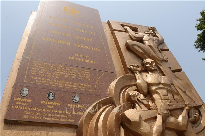 Trên tấm bia, lời khen tặng của Chủ tịch Hồ Chí Minh được khắc ghi trang trọng: “Đặc biệt tinh nhuệ; Anh dũng tuyệt vời; Mưu trí táo bạo; Đánh hiểm thắng lớn". Ảnh: Dương Chí Tưởng/TTXVN