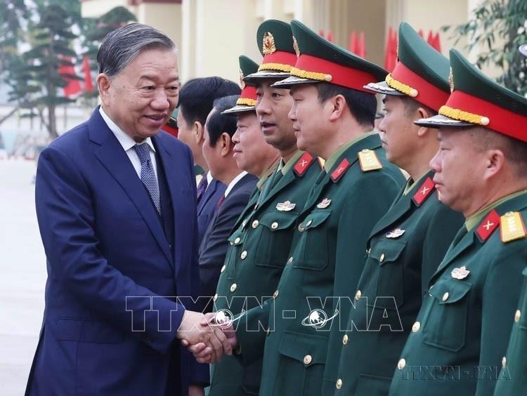 Tổng Bí thư Tô Lâm, Bí thư Quân uỷ Trung ương thăm, làm việc tại Lữ đoàn tên lửa 490, Binh chủng Pháo binh (10/2/2025). Ảnh: Thống Nhất – TTXVN