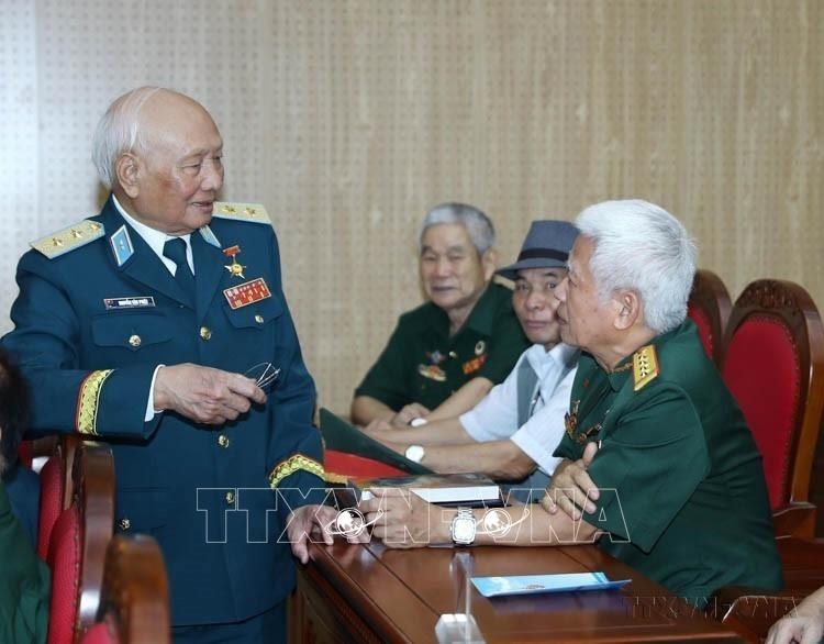 Trung tướng, Anh hùng LLVT Nguyễn Văn Phiệt, từng bắn rơi nhiều máy bay Mỹ trong ""Chiến dịch 12 ngày đêm'' và các cựu chiến binh bộ đội tên lửa phòng không tại buổi Gặp mặt kỷ niệm 60 năm Ngày truyền thống Bộ đội tên lửa phòng không (24/7/1965 - 24/7/2025). Ảnh: Trọng Đức - TTXVN