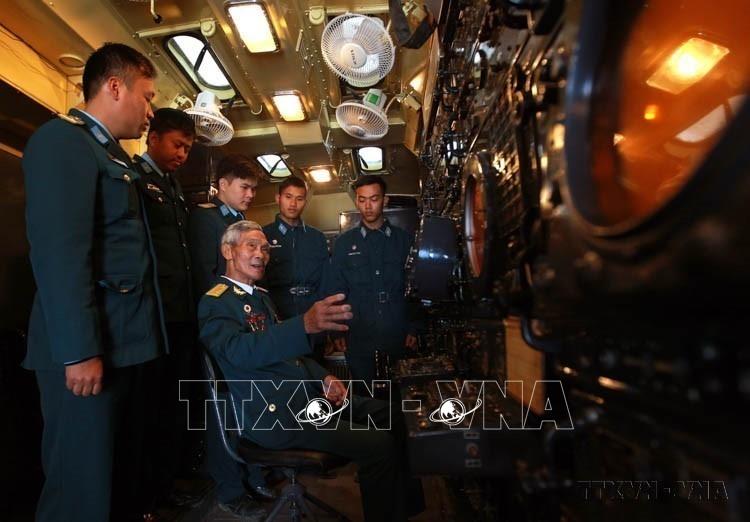 Đại tá Đinh Thế Văn, Anh hùng LLVT nhân dân (nguyên Tiểu đoàn trưởng Tiểu đoàn 77, Trung đoàn 257) thăm lại Tiểu đoàn tên lửa 77 và trao đổi kinh nghiệm với các chiến sỹ trong cabin xe điều khiển tên lửa. Ảnh: An Đăng - TTXVN