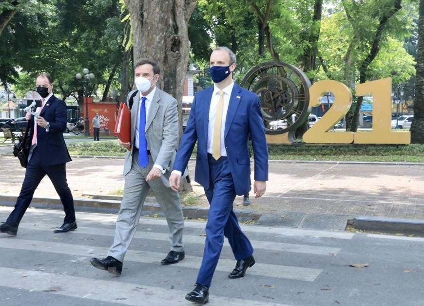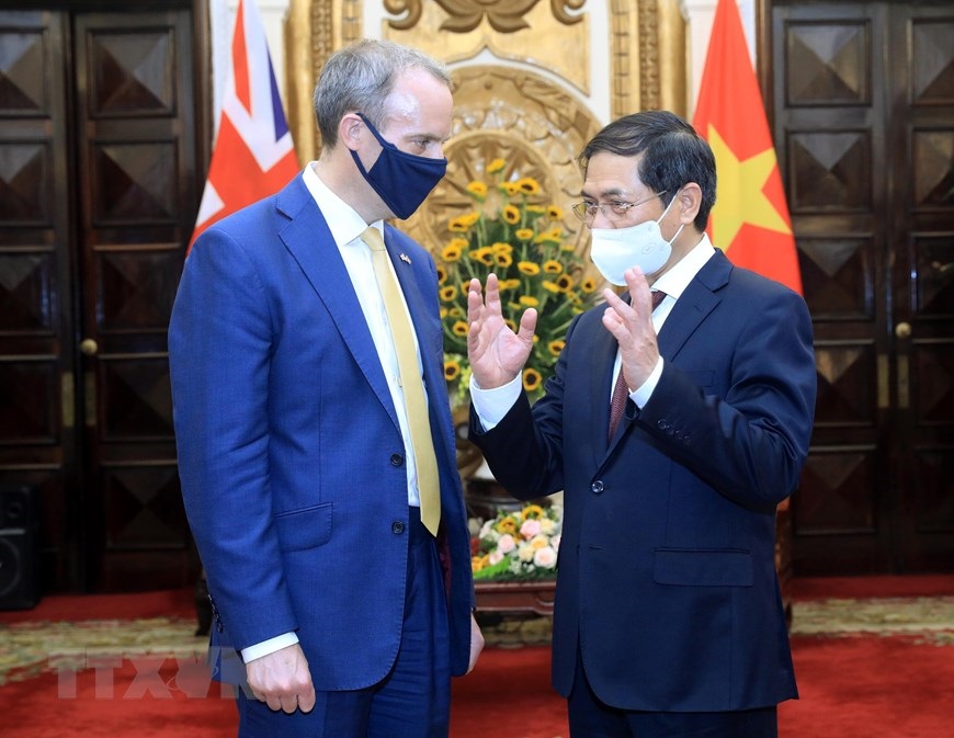 Bộ trưởng Bộ Ngoại giao Bùi Thanh Sơn với Bộ trưởng Ngoại giao và Phát triển Vương quốc Anh Dominic Raab. (Ảnh: Lâm Khánh/TTXVN)