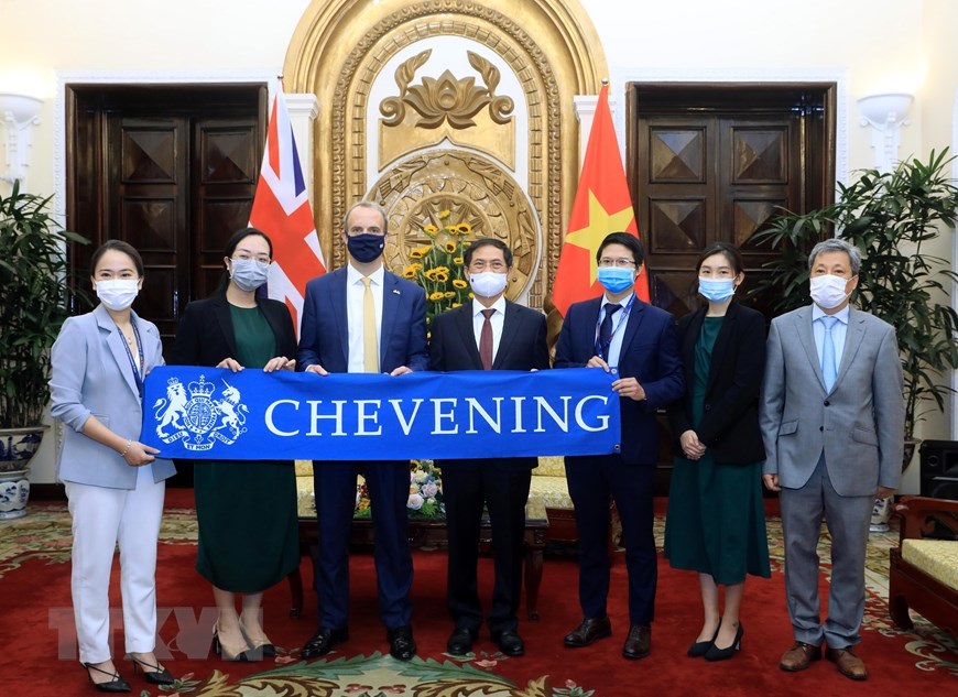 Bộ trưởng Bộ Ngoại giao Bùi Thanh Sơn, Bộ trưởng Ngoại giao và Phát triển Vương quốc Anh Dominic Raab với các công dân nhận học bổng Chevening của Chính phủ Anh. (Ảnh: Lâm Khánh/TTXVN)