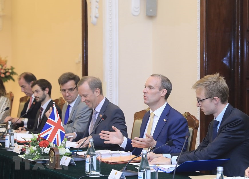 Bộ trưởng Ngoại giao và Phát triển Vương quốc Anh Dominic Râb hội đàm với Bộ trưởng Bộ Ngoại giao Bùi Thanh Sơn. (Ảnh: Lâm Khánh/TTXVN)