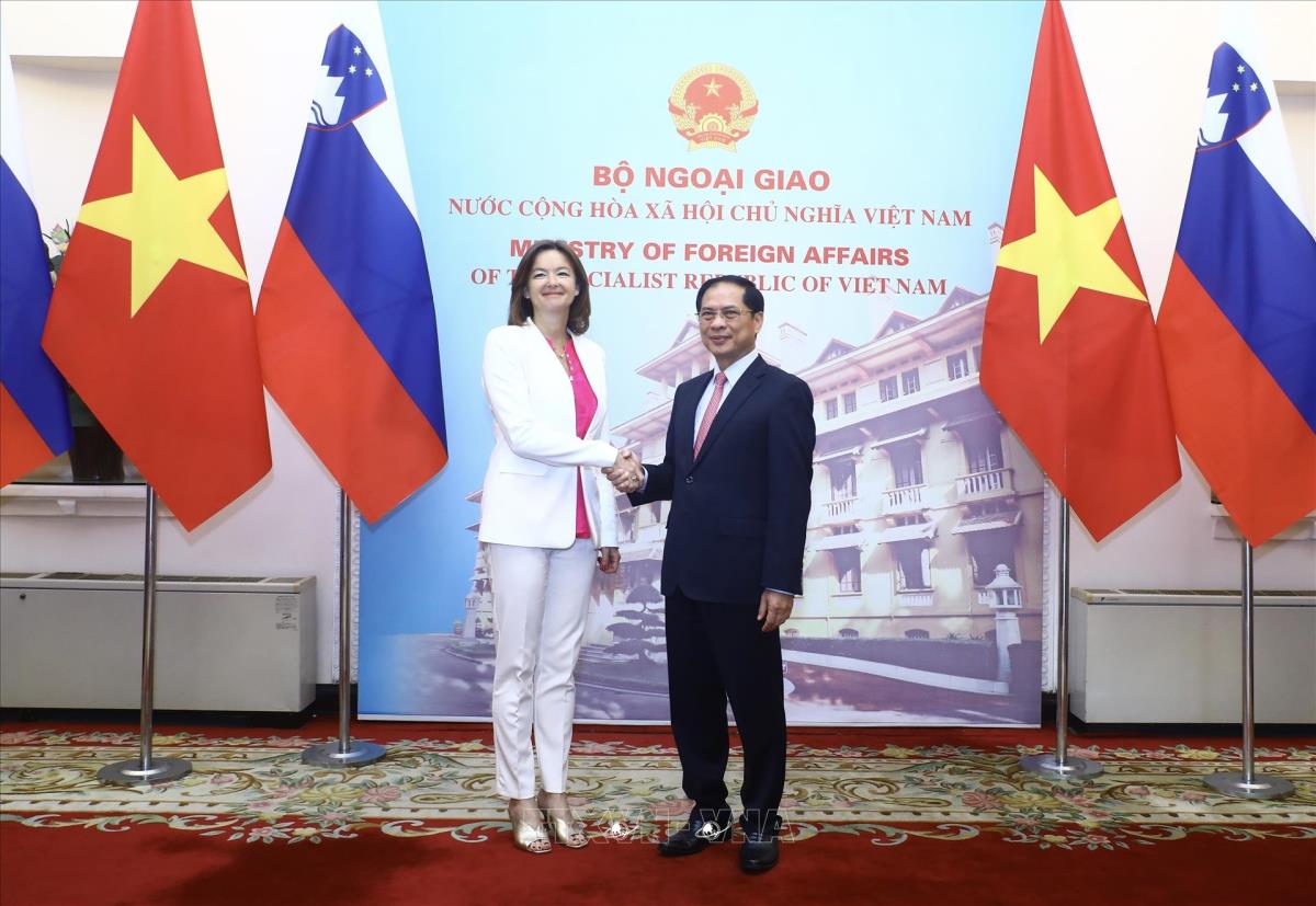 Bộ trưởng Ngoại giao Bùi Thanh Sơn hội đàm với Phó Thủ tướng, Bộ trưởng Ngoại giao và Các vấn đề châu Âu Cộng hoà Slovenia Tanja Fajon (23/5/2023). Ảnh: Lâm Khánh/TTXVN